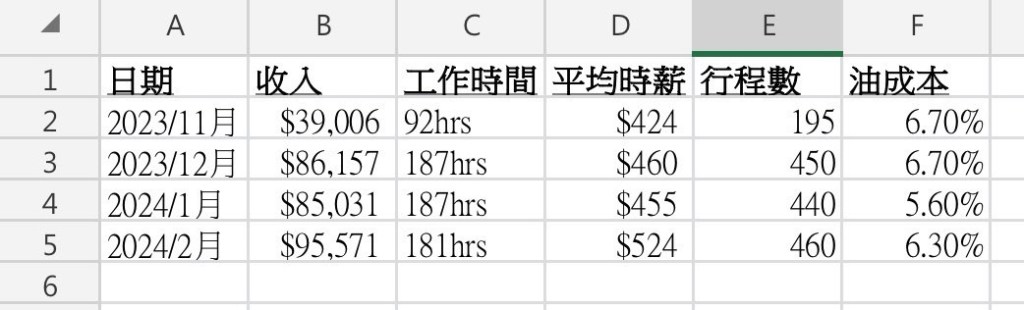 劉伯烏註:Uber新駕駛於2023/11開始。剛好這4個月是每年固定的過年前後旺月(旺季),所以時薪高,劉伯烏個人統計Uber台北的時薪平均在400元左右,駕駛使用Toyota Cross (CC)油電,所以在油錢的節省上,明顯的勝出油車。