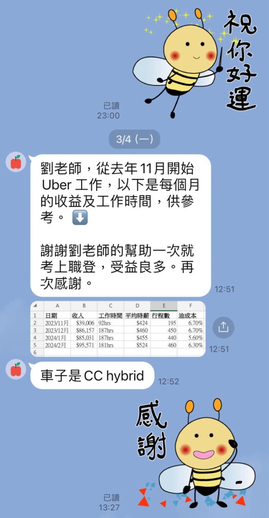 [來函照登]劉老師,從去年11月開始Uber 工作,以下是每個月的收益及工作時間,供參考。