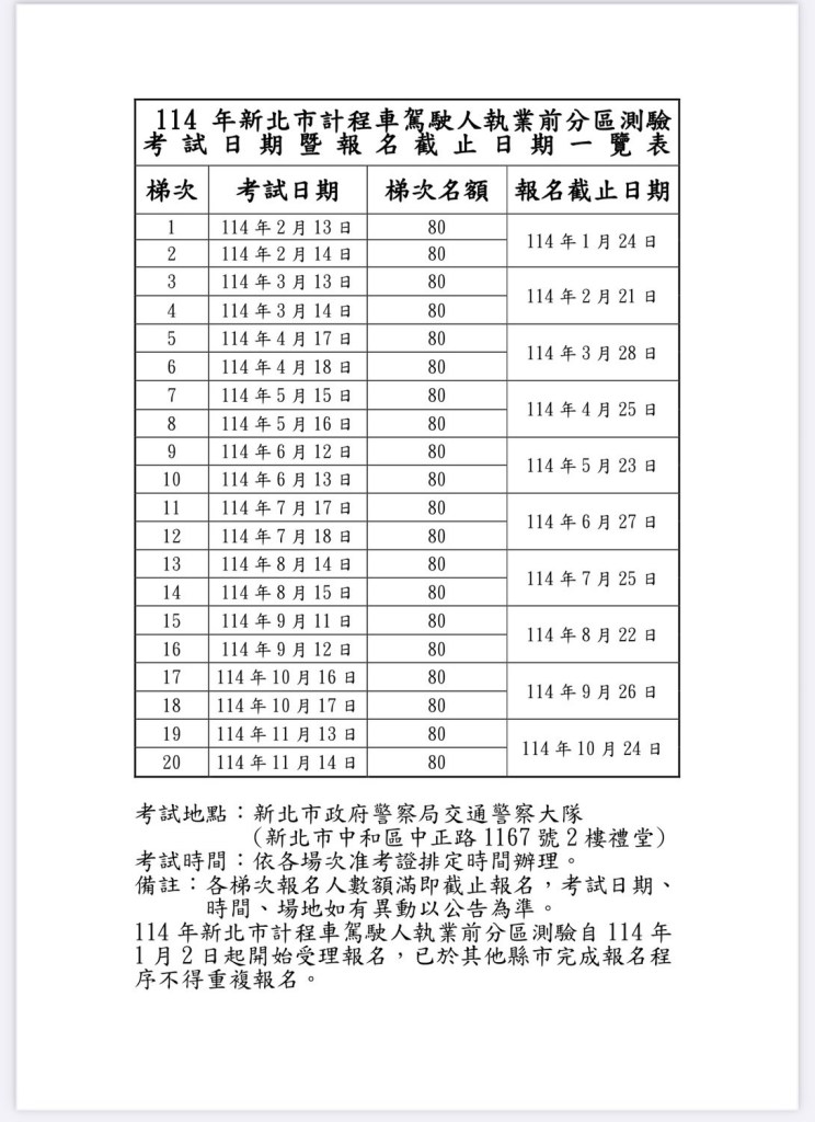 114年新北市計程車駕駛人執業前分區測驗 。(每梯次名額80人)