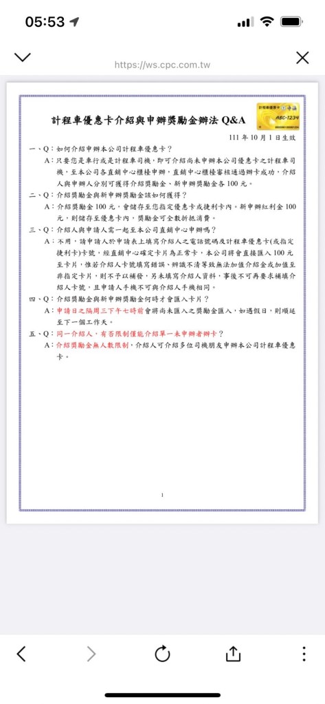 一、 本公司「優惠卡」係針對計程車司機所需用之油料進行補助,故司機需駕駛計程車時方可使 用,如非駕駛計程車時,本公司將予拒絕使用。