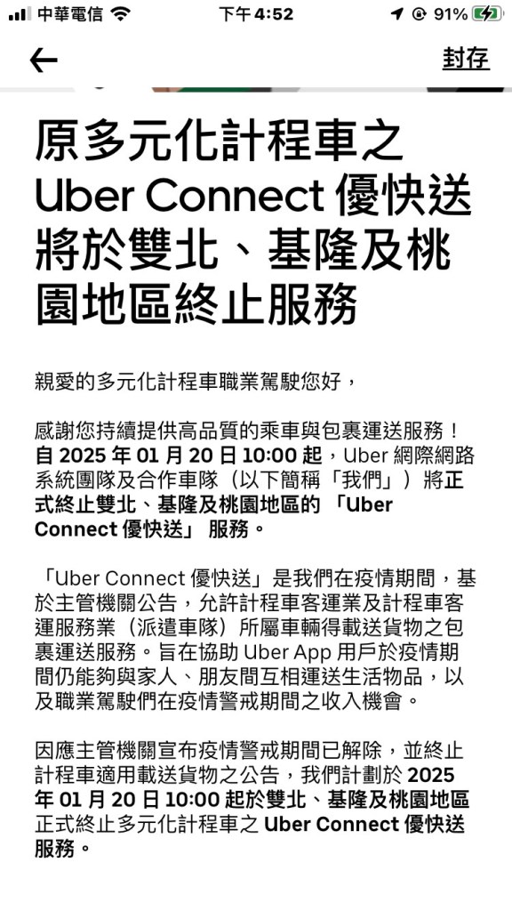 因應主管機關宣布疫情警戒期間已解除,並終止計程車適用載送貨物之公告,我們計劃於 2025 年 01 月 20 日 10:00 起於雙北、基隆及桃園地區正式終止多元化計程車之 Uber Connect 優快送服務。
